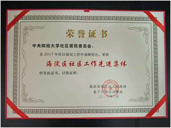 近日,中央财经大学社区居民委员会荣获2017年“海淀区社区工作先进集体”称号。