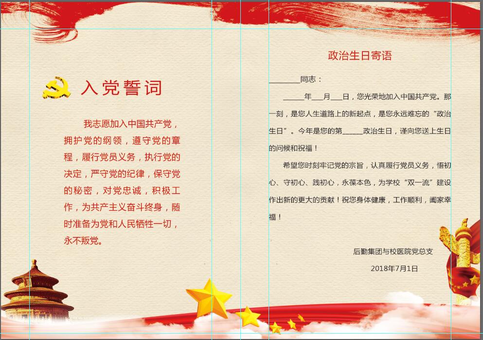 通过一张小小的贺卡,让每位党员同志重温一次入党誓词,强化党员“四个意识”,切实增强党员的荣誉感、责任感和使命感,以促使党员在工作上严格要求自己,亮明身份,做好表率,努力做一名“忠诚、干净、担当”的合格党员。